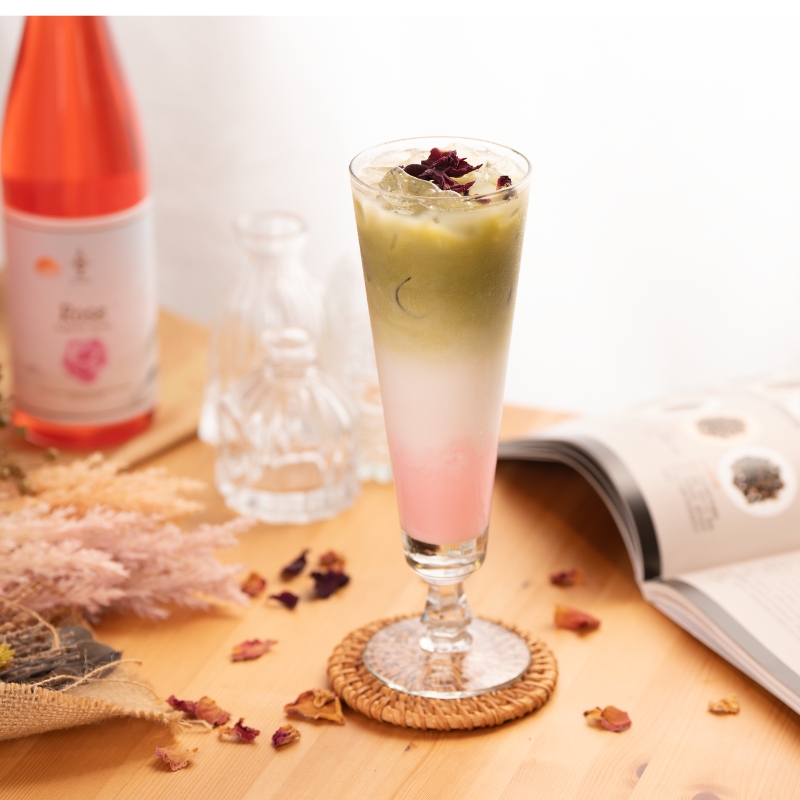 Mix rose syrup with a small amount of milk.Add ice for a layered texture.
